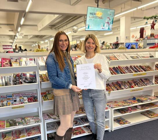 Der Handelsverband Bayern gratuliert dem Secondhand-Laden M&W Secondhand in Krumbach ganz herzlich zu einem Vierteljahrhundert erfolgreicher Arbeit und überreicht der Inhaberin Yvonne Marquard die Jubiläumsurkunde.